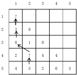 为了方便计算我们将数塔中的值存到如下图所示的二维数组中,该数塔的行走路线将如下图的箭头所示。