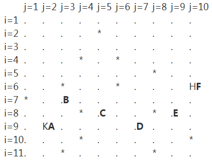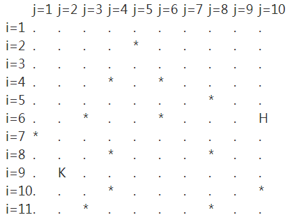 10 11 .......... ....*..... .......... ...*.*.... .......*.. ..*..*...H *......... ...*...*.. .K........ ...*.....* ..*....*..