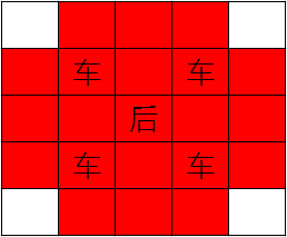 红色格子为样例中被控制到的格子,中间那个后能够斜着走到四个角落的格子(图中白色的格子),但因受到四个车的阻隔而不能控制到那四个格子!