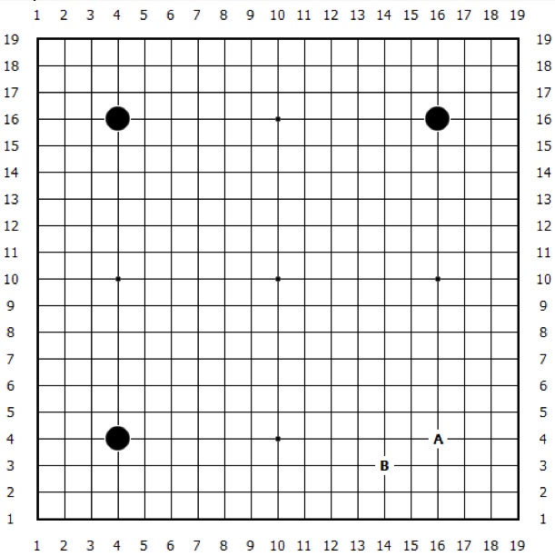 小X的老师很喜欢围棋。众所周知,围棋的棋盘有19行19列,共有361个交叉点。为方便起见,我们把这些行列按顺序编号为1~19,并用(x, y)表示第x列第y行的位置。例如下图中,A用(16,4)表示,B用(14, 3)表示。