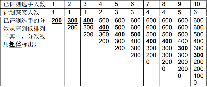 更具体地,若当前已评出了 p 个选手的成绩,则当前计划获奖人数为 \max(1, \lfloor p * w \%\rfloor),其中 w 是获奖百分比,\lfloor x \rfloor 表示对 x 向下取整,\max(x,y) 表示 x 和 y 中较大的数。如有选手成绩相同,则所有成绩并列的选手都能获奖,因此实际获奖人数可能比计划中多。