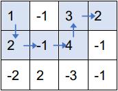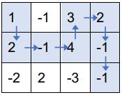 按上述走法,取到的数之和为 1 + 2 + (-1) + 4 + 3 + 2 + (-1) + (-1) = 9,可以证明为最大值。