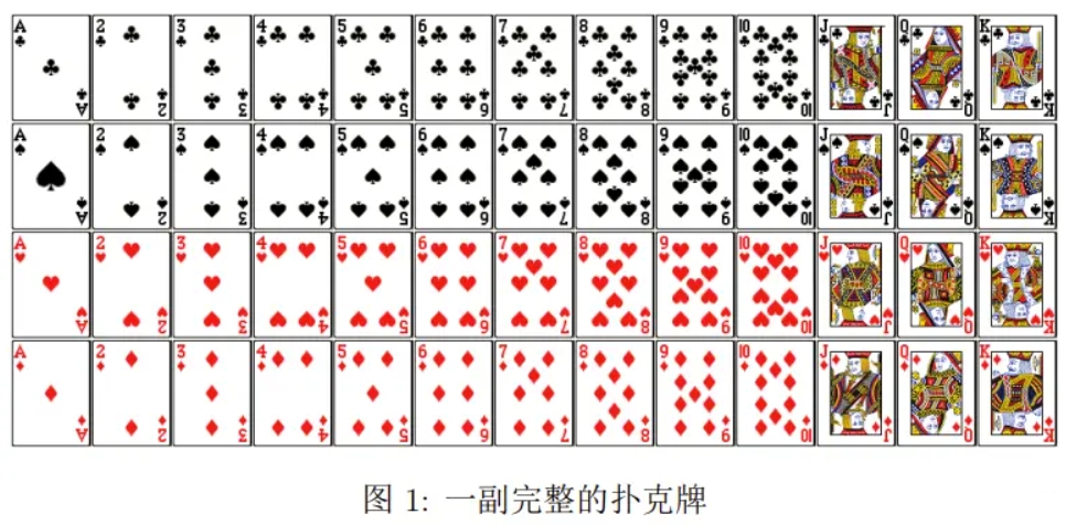 我们称一副扑克牌是完整的,当且仅当对于每一种花色和每一种点数,都恰好有一张牌具有对应的花色和点数。由此,一副完整的扑克牌恰好有 4 \times 13 = 52 张牌。以下图片展示了一副完整的扑克牌里所有的 52 张牌。