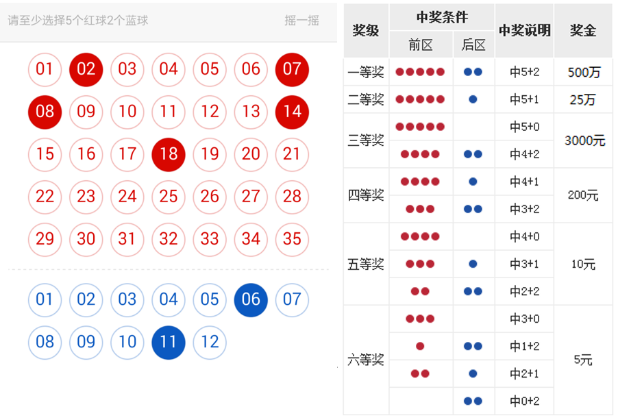 前区有 14 和 18 两个数字相同,后区 6 和 11 都相同,对照表格,中奖 2+2 为五等奖,奖金 10 元。
