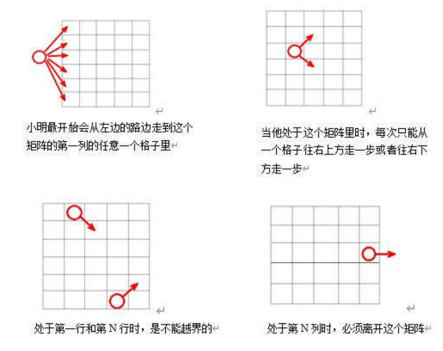 当他处于这个矩阵里时,每次只能从一个格子往右上方走一步或者往右下方走一步;但是当他处于第一行时,就只能往右下方走;同理,当他处于第 N 行时,就只能往右上方走。
