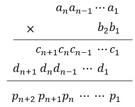 一个 n 位数的正整数 A=anan-1…a1 和另一个 2 位数的正整数 B=b2b1 相乘,其乘法展开式如下图所示: