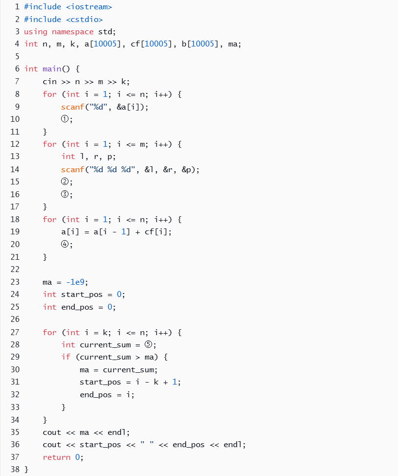 程序描述: 以下程序使用差分数组技术处理区间修改,并通过滑动窗口寻找长度为 k 的最大子数组和。程序首先构建差分数组,然后进行区间增减操作,最后计算前缀和并找出最大子数组和及其位置。