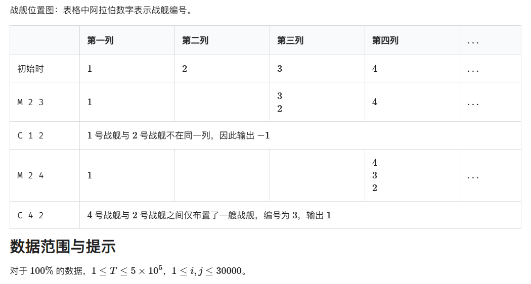 M i j:i 和 j 是两个整数,表示指令涉及的战舰编号。该指令是莱因哈特窃听到的杨威利发布的舰队调动指令,并且保证第 i 号战舰与第 j 号战舰不在同一列。C i j:i 和 j 是两个整数,表示指令涉及的战舰编号。该指令是莱因哈特发布的询问指令。依次对输入的每一条指令进行分析和处理: