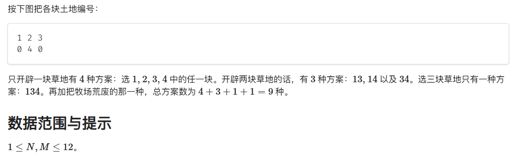 Farmer John 新买了一块长方形的牧场,这块牧场被划分成 M 行 N 列 (1≤M≤12; 1≤N≤12),每一格都是一块正方形的土地。FJ 打算在牧场上的某几格土地里种上美味的草,供他的奶牛们享用。遗憾的是,有些土地相当的贫瘠,不能用来放牧。并且,奶牛们喜欢独占一块草地,于是 FJ 不会选择两块相邻的土地,即:没有哪两块草地有公共边。当然,FJ 还没有决定在哪些土地上种草。
