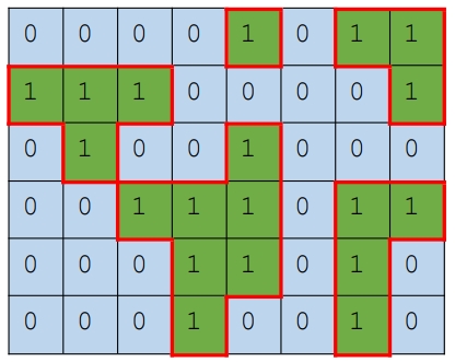 接下来输入M行,每行N个整数,表示地形图(1表示陆地,0表示海水),两个整数之间用一个空格隔开。