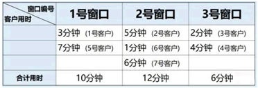 全部客户办理完业务后,三个窗口总用时分别为 10分钟、12分钟、6分钟,用时最短的是窗口 3,最短时间为 6 分钟。