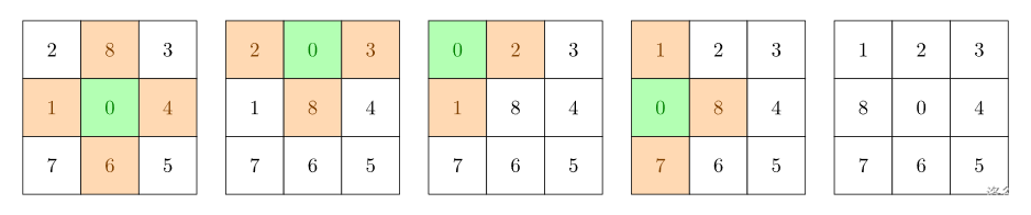 图中标有 0 的是空格。绿色格子是空格所在位置,橙色格子是下一步可以移动到空格的位置。如图所示,用四步可以达到目标状态。 并且可以证明,不存在更优的策略。
