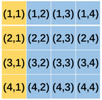 图中标注为黄色的四个格子是黄金格(注:原题有图示,此处仅列出坐标),坐标分别为 (1, 1), (2, 1), (3, 1), (4, 1)。