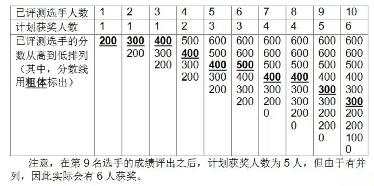 更具体地,若当前已评出了 p 个选手的成绩,则当前计划获奖人数为 \max(1, \lfloor p \times w \%\rfloor),其中 w 是获奖百分比,\lfloor x \rfloor 表示对 x 向下取整,\max(x,y) 表示 xy 中较大的数。如有选手成绩相同,则所有成绩并列的选手都能获奖,因此实际获奖人数可能比计划中多。