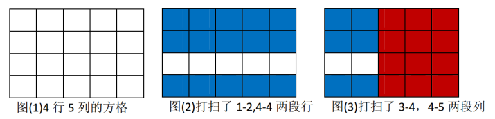 每个男生负责打扫一些连续的行,每个女生负责打扫一些连续的列。比如有两个男生,第一个男 生负责第 1、2 两行、第二个男生负责第 4行,如图(2)的蓝色。